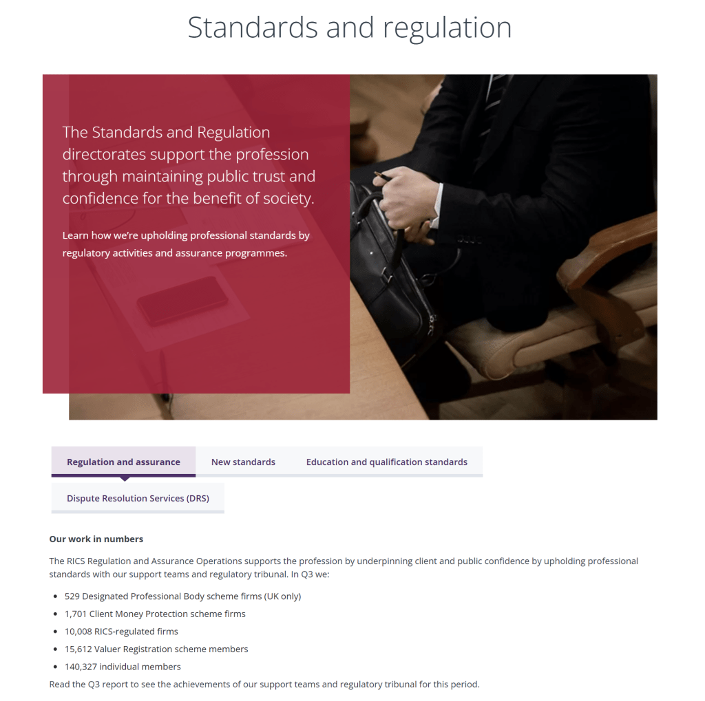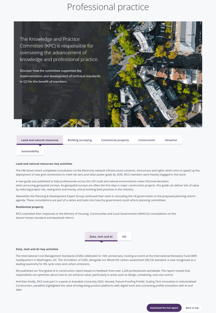 Every quarter, RICS releases a report highlighting different initiatives that are empowering members and spreading information about the profession globally. To support the report, I created webpage copy by sourcing content from the report to show a snapshot of some of these achievements for those who may not have time to download and read the full report (although there is still a call-to-action encouraging people to download).
