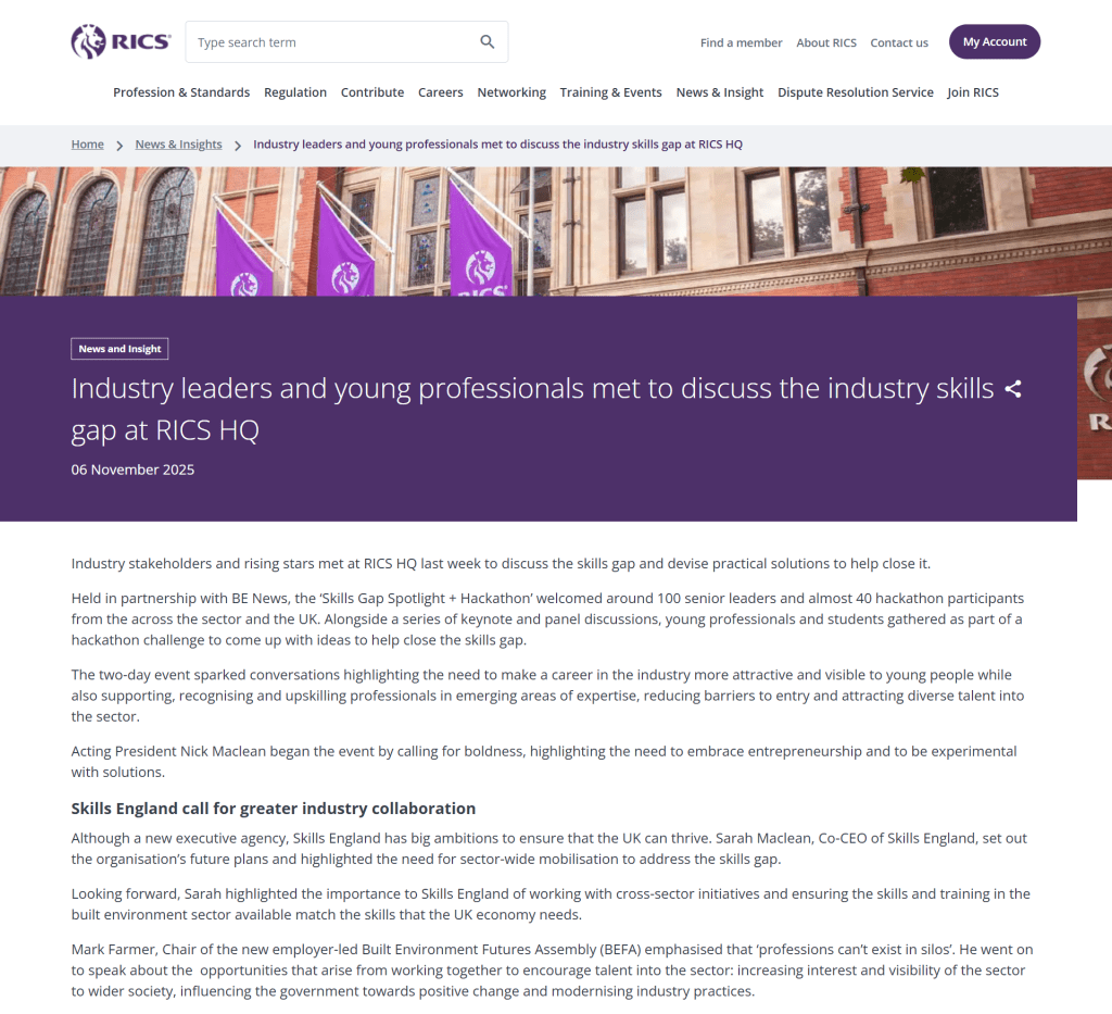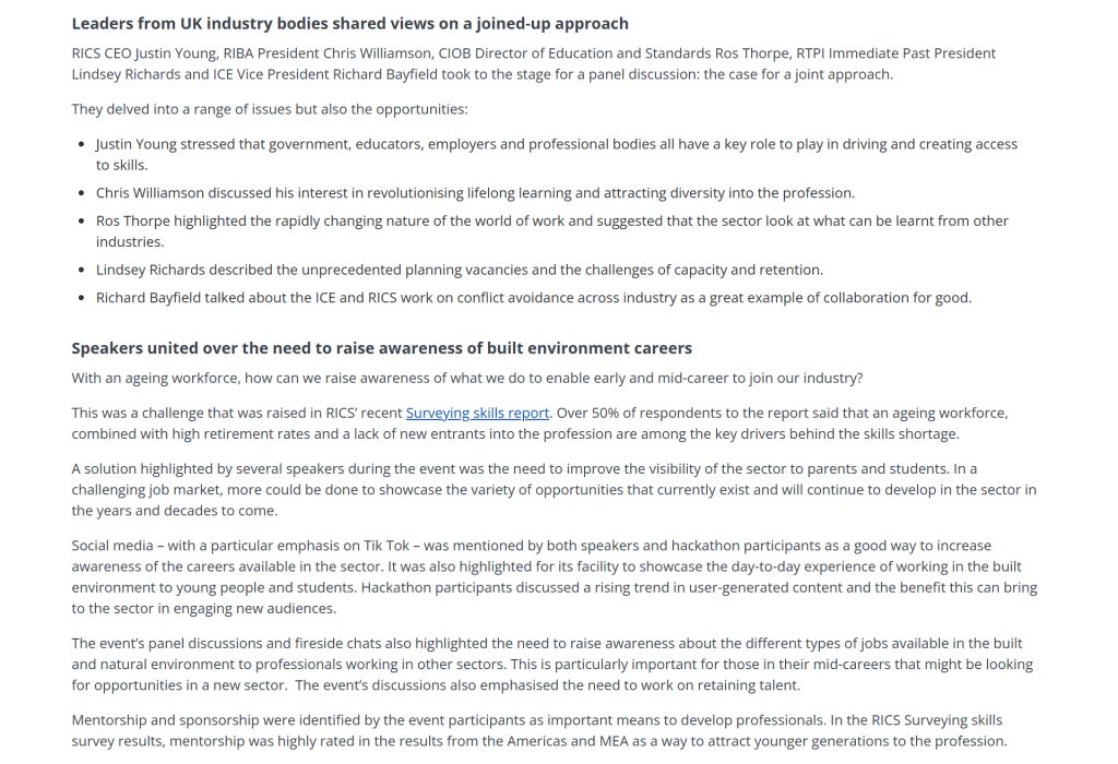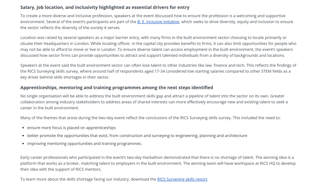In a first-of-its-kind report, RICS commissioned a report highlighting the skills and knowledge gap affecting the surveying industry. To help promote the report, bring awareness to the issue and start formulating ideas to close this gap, RICS hosted a summit and hackathon session that brought industry experts and professionals together. I attended the day-long summit session and wrote a summary of the day’s discussions to be shared on the RICS website for those unable to attend.